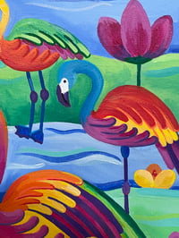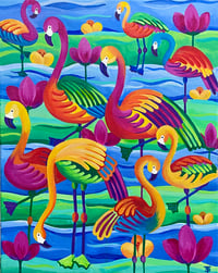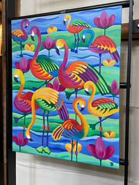 This is an incredibly colourful and cheerful print of a flamboyance of Flamingos.