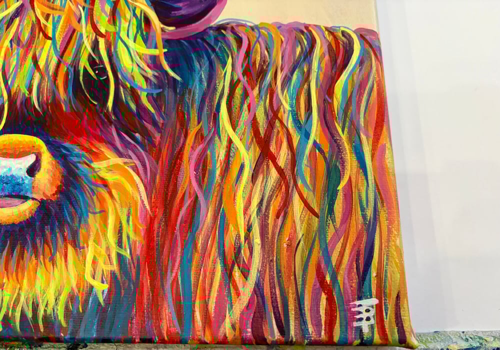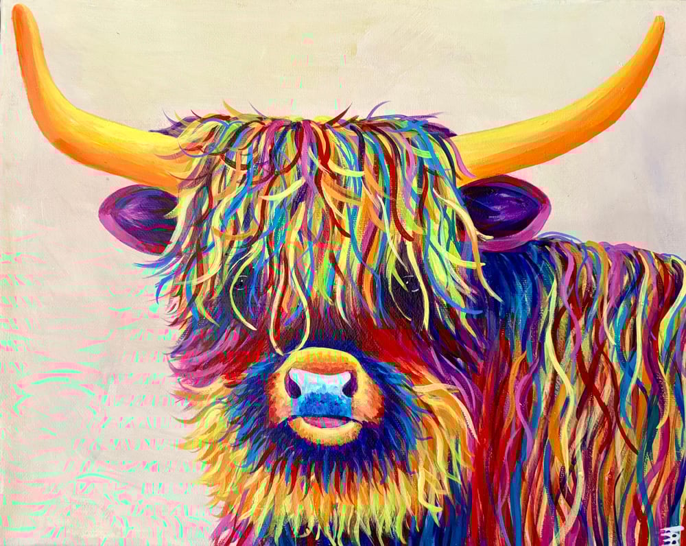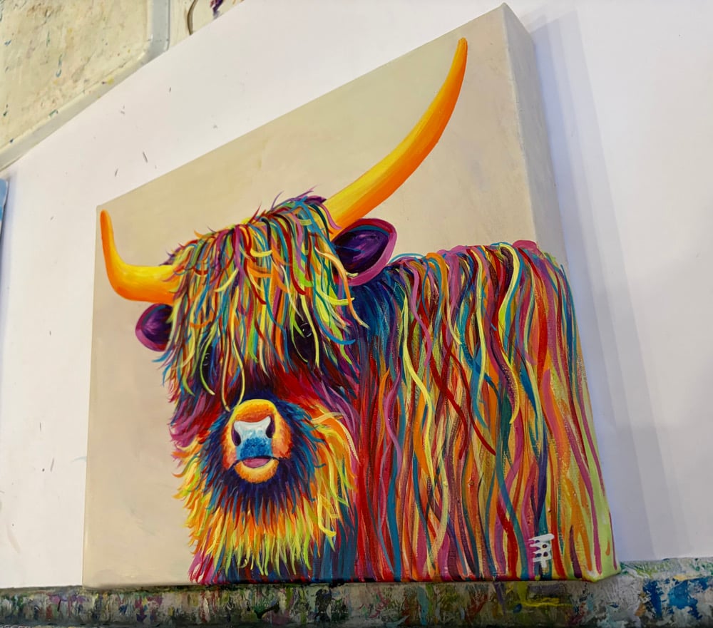 Harry the Highland is a cheeky little fellow. He’s arrived to make you smile!! Covered in colour and fun.