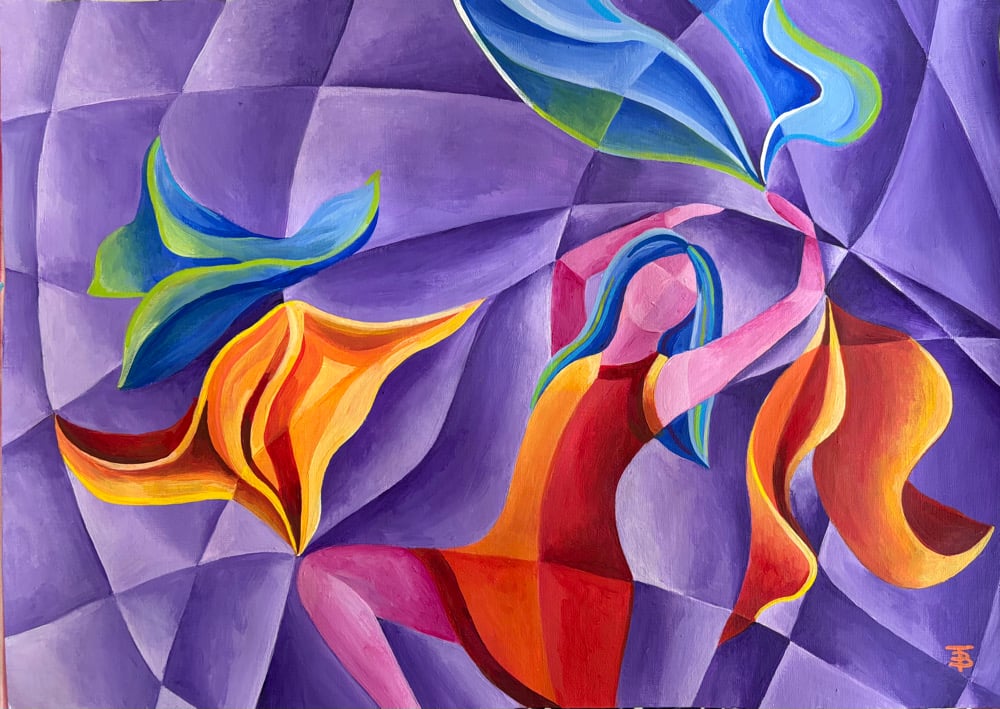 'Dancing with Scarves’ A3 and framed in white (purple background and figure with scarves) £300