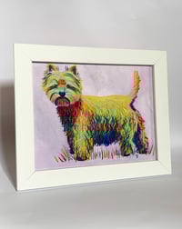 This is an acrylic painting of a West Highland Terrier, but done in a Rainbow style!