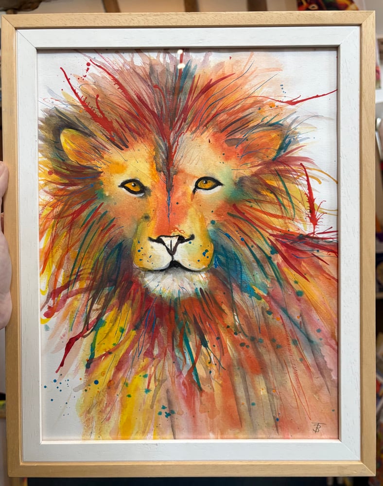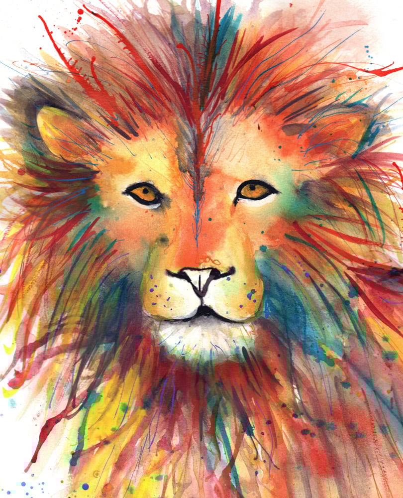 This is a beautiful original ink splashy painting of a face of a kindly lion.