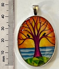 This is a beautiful hand drawn pendant with a silhouette of a tree at sunset.