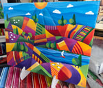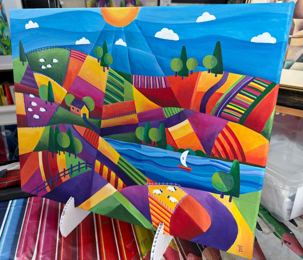 This is a colourful original acrylic painting of ‘The Sheep Farmers Field’.