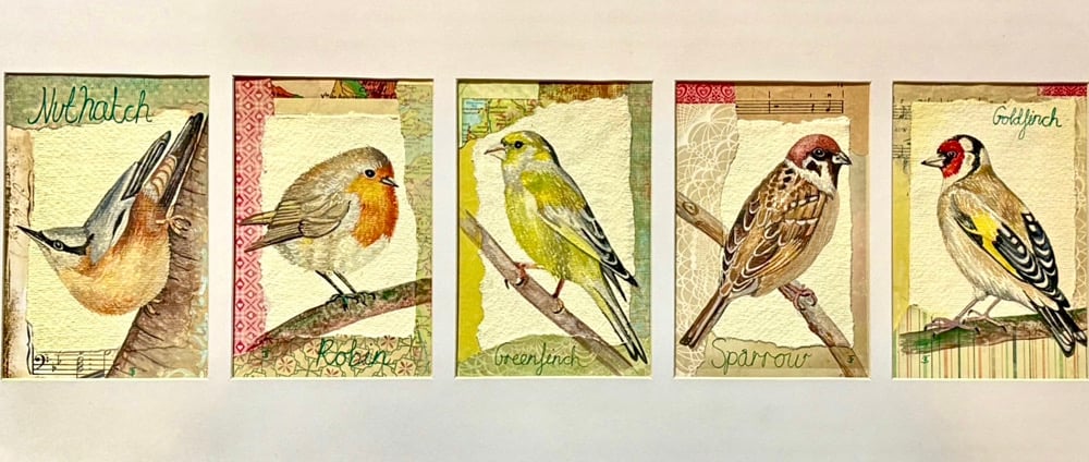 This is an original watercolour and collage painting of 5 UK Garden Birds.
